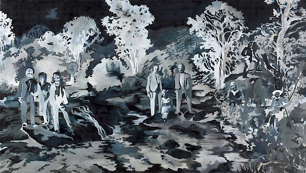 בשנתיים האחרונות יצרה נטע ליבר-שפר כמה ציורים המתארים דימוי נגטיבי, רעיון המבוסס על תשלילי צילום. הציורים הללו נעשו בהשראת תצלומי משפחה ישנים שקיבלה ושבהן מופיעות דמויות שכבר אינן מזוהות. בציור שלפנינו חיברה נטע שלושה תצלומים של אותן שלוש דמויות -שני גברים ואישה – שצולמו בשעת טיול בטבע. האנשים לבושים בבגדים מחויטים ונראה כי התמונה צולמה באירופה במחצית הראשונה של המאה ה-20. בנוסף לכך "הפכה" נטע את הדימויים לנגטיביים, אלא שלא הקפידה על כך לגמרי וחלקים מהציור נותרו פוזיטיביים. נטע מספרת שהיא אינה אוהבת לעסוק ב"כאן ועכשיו" והתצלומים הללו מאפשרים לה לברוח למקומות רחוקים ולעסוק בסיטואציות לא מוכרות. יש בציור הזה מימד של מסתורין שכן הוא מעורר שאלות כגון מיהם האנשים הללו? היכן צולמו? מי צילם אותם? ומה הקשר ביניהם? האפקט החזותי של התמונה הסופית מעניין שכן הדגם שנוצר דומה לזה של בד הסוואה.