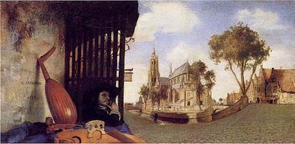 זוהי אחת התמונות המיוחדות אשר צוירו בהולנד ב"תור הזהב". בתמונה נראה דוכן לממכר כלי נגינה בכיכר המרכזית של דלפט שבה נראים הקתדרלה החדשה (Nieuwe Kerk) ובית העירייה. הצייר תיאר את הדוכן ואת הנוף ברקע בהקצרה יוצאת דופן ובעיוות, המעידים ללא ספק על כך שנעזר לצורך יצירת התמונה באמצעי אופטי כלשהו: מראה, עדשה או "קמרה אובסקורה".