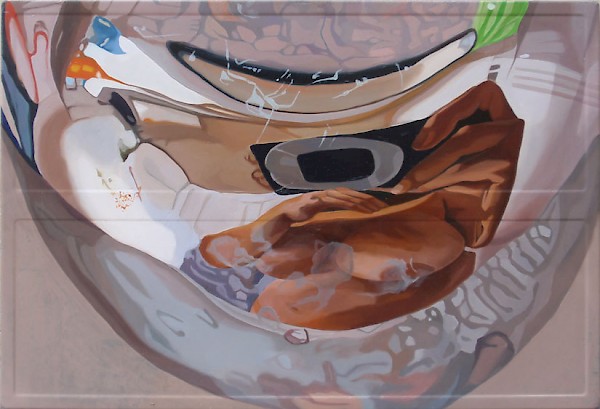 לאורך כל העת החדשה, גילה הקהל חיבה לחיקוי מדויק של המציאות ולאשליות אופטיות. בציוריה מפלרטטת נעמי מנדל עם הנטייה הזאת של הקהל ומשוחחת אגב כך עם זרמים באמנות כגון הפוטו-ריאליזם. הציור שלפנינו מתעד את פעולת הצילום בעידן הדיגיטלי המהיר, הוא מבוסס על צילום אקראי שנעשה במקלחת ומתאר חוויה יומיומית: את ההנאה שלנו מההשתקפויות המעוותות שלנו מחפצים בוהקים כמו ברזים. המצלמה בציור ממוקמת במקום הפנים, היא העין והציור עוקב אחרי הצילום שראתה המצלמה ולא העין של הציירת. למעשה ואולי במפתיע, נעמי מציירת את הציורים שלה מתדפיסים באיכות נמוכה שהיא מדפיסה במדפסת הביתית.