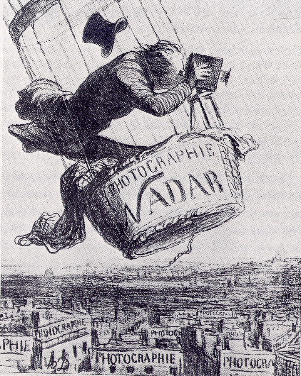 הקריקטוריסט והצייר אונורה דומייה – שהיה מתנגד חריף לצילום – לעג לנאדאר בקריקטורה בה נראה הצלם בכדור פורח "מעלה את הצילום לדרגת אמנות". נראה שדומייה היה אחד מאותם ציירים שסבלו באותה עת מ"פוטופוביה", חרדה מצילום, שכן על כל הבתים בעיר נראות כתובות ענק המציינות סטודיו לצילום.