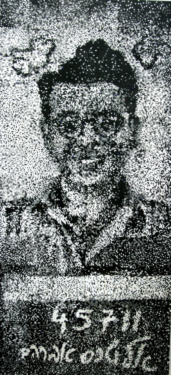 טובה לוטן, "אבא כחייל נצור", 2004, חרוזי פלסטיק מגוהצים על עץ, 200X100 ס"מ